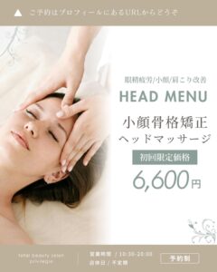 小顔になりたい方必見!!!Posted on 2025年9月23日 by post お顔の骨格バランスを整えて、スッキリ小顔へ! 目の疲れ・肩こり・ストレスにもアプローチする 「小顔骨格矯正ヘッドマッサージ」 初回限定価格は【6,600円】 頭から全身へ広がるリフレッシュ感を ぜひご体験ください♪